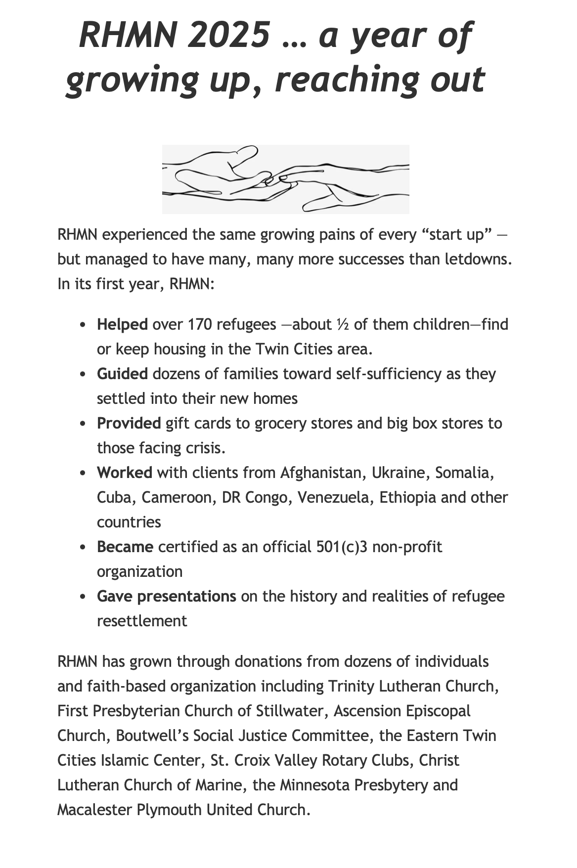 RHMN worked with the family to find housing, assisted them in signing a lease, and helped them pay security deposit and rent. “We’ve been through a tough time,” explained the father. “But everyday we’re adjusting. We want to support ourselves. We want to get drivers’ licenses. We want to find work; just a regular job. We want our kids to study.” They want the American Dream.