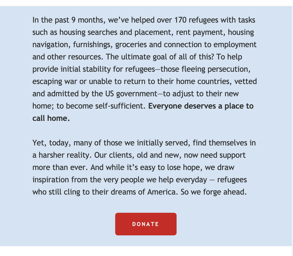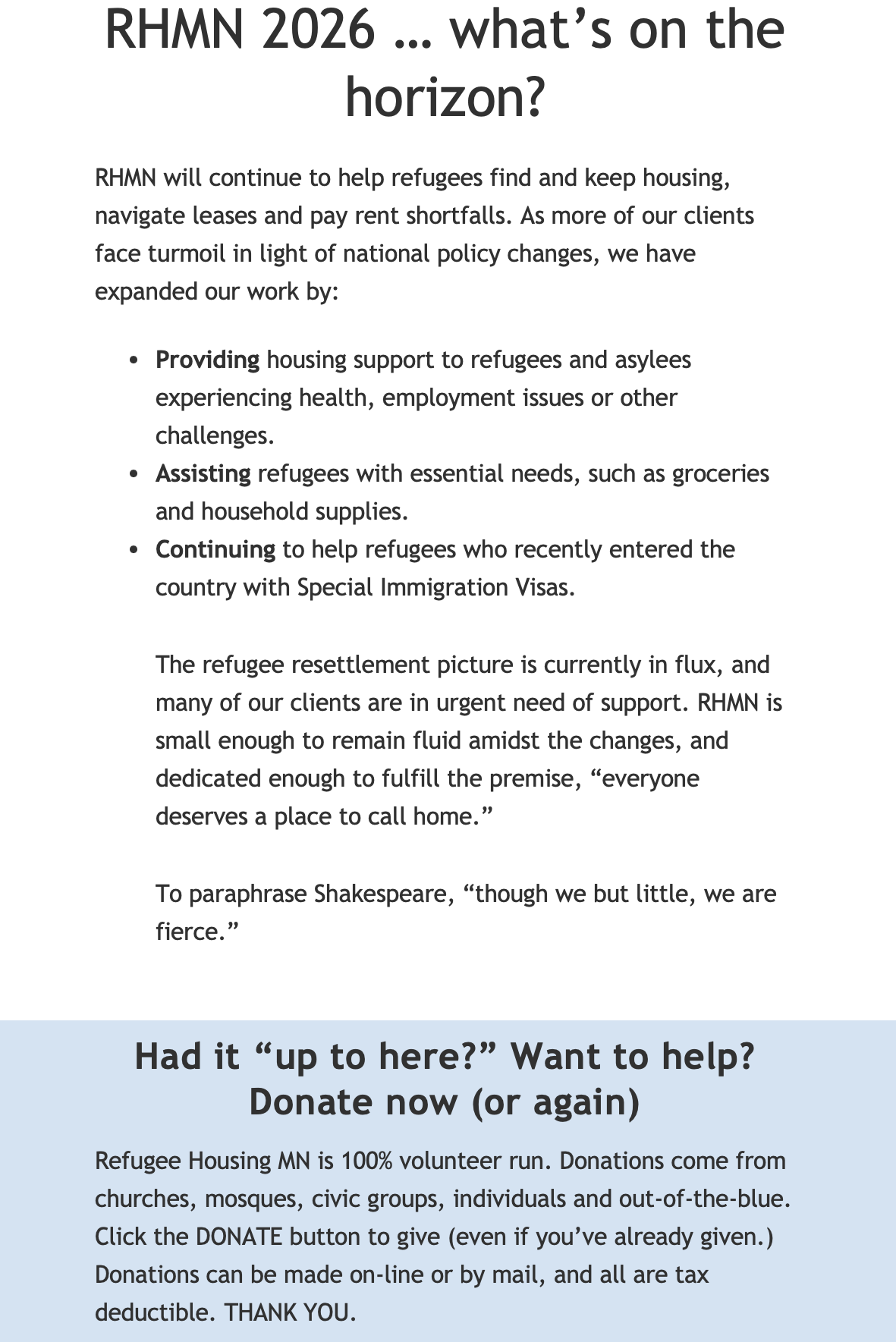 Undeterred and under threat of their SIVs expiring, the family of 5 raised sufficient funds through family and friends to purchase their own airline tickets. Upon arrival—lacking resettlement funding and services—they moved in with a relative. Homeless and down-trodden; this was not the American dream. And then the met Ahmad Shah; founder of the Afghan Community of Minnesota and board member of Refugee Housing Minnesota (RHMN).